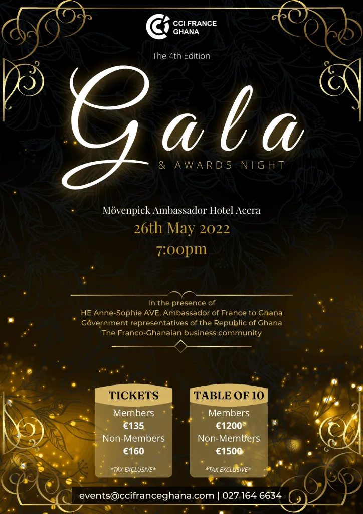 Nominations are open for the 4th edition of the CCI France Ghana Gala and Awards Night. Nominate a company in any of the categories below: Product/Service of the year Best Digital project/ Innovation Best CSR project Company of the year Click Here for the Rules of Nomination & Click Here to Nominate a business. Date: 26th May 2022 Time: […]