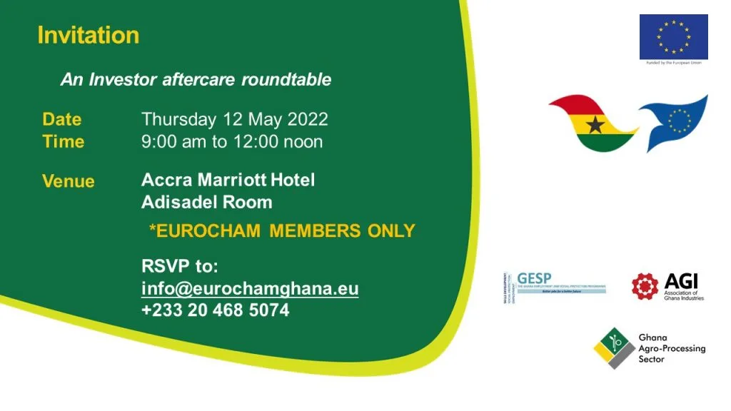 EUROCHAM Ghana, in collaboration with the EU-funded Investment Promotion, Business Linkages & Export Development Project, is organizing an investor aftercare roundtable. This investor aftercare roundtable is to discuss and help identify issues affecting EUROCHAM members and their investments in Ghana. The outputs from the aftercare roundtable discussions will be used to highlight potential aftercare support […]